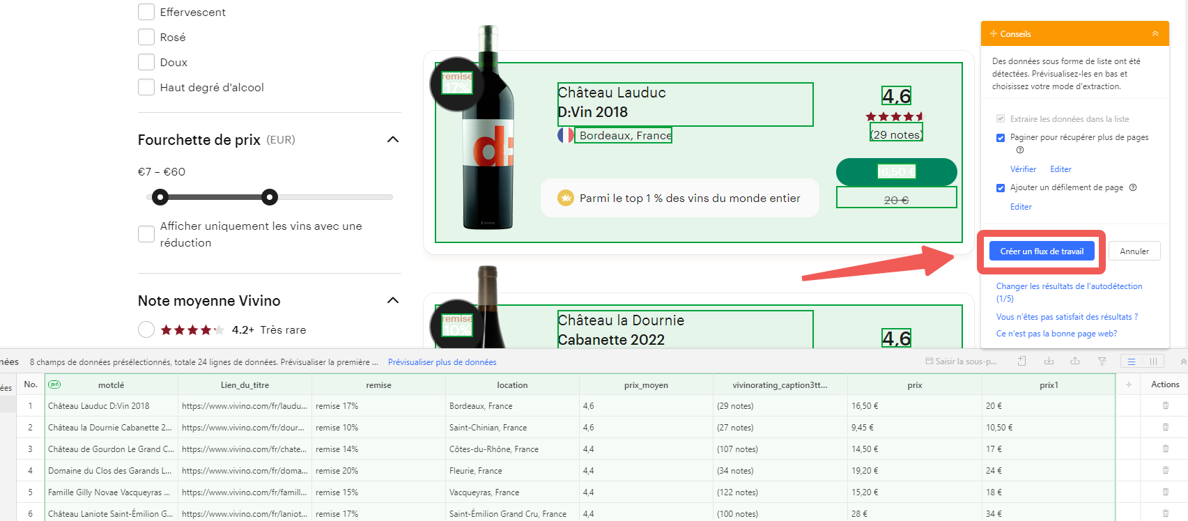Une fois l’auto-detection terminée, cliquez sur “Créer un flux de travail“. Vous pourrez alors voir les données à extraire dans l’aperçu des données en bas de la fenêtre.