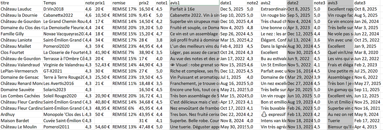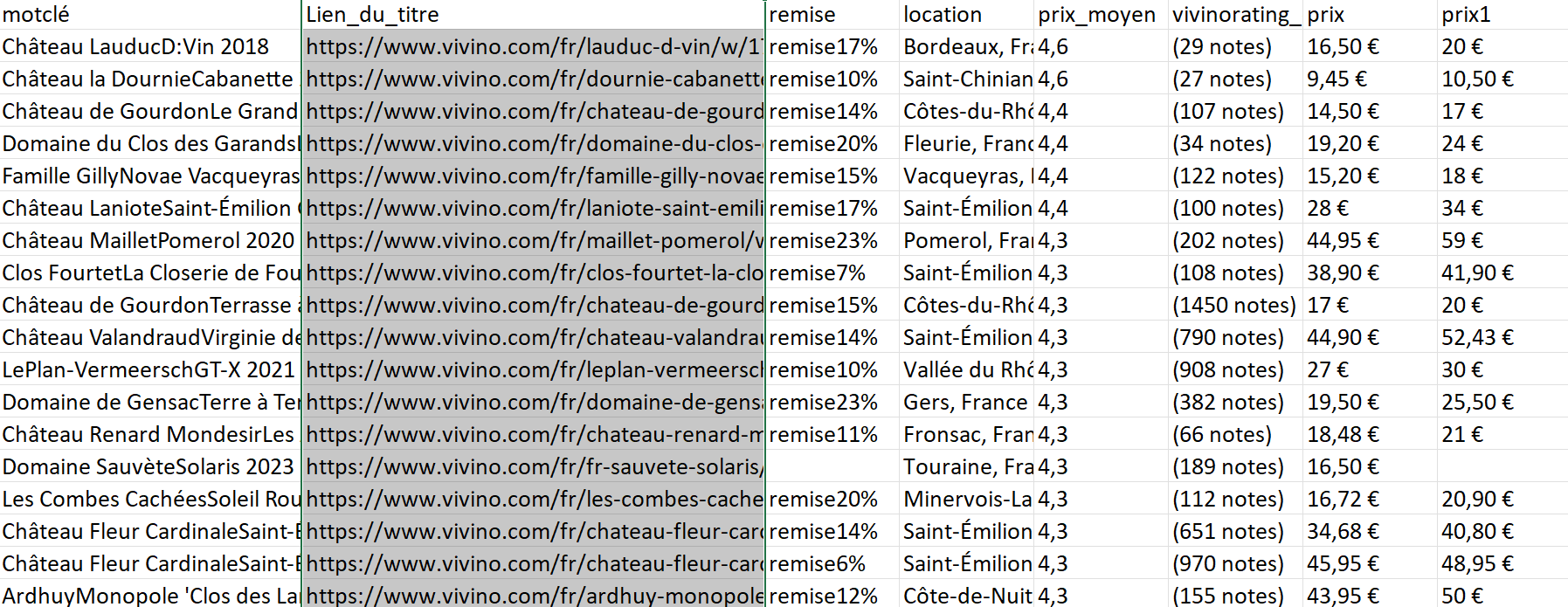 Vous trouverez ci-dessous les données que j’ai recueillies, incluant les informations sur les remises, le prix et des liens vers les sous-pages de chaque type de vin :