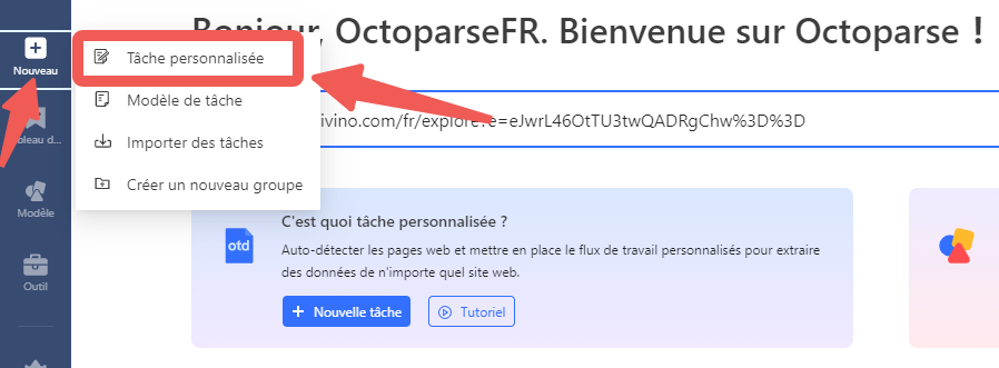 Revenons maintenant à la page d’accueil du client Octoparse. Cliquez sur “Nouveau” dans la barre de navigation à gauche, puis sélectionnez “Tâche personnalisée“.