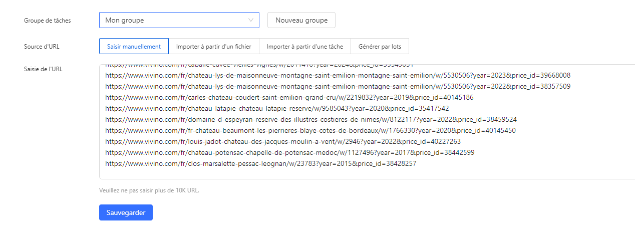 Collez l’URL de la page de détails que nous avons collectée précédemment, puis cliquez sur “Sauvegarder“. Octoparse commencera alors à extraire les commentaires de chaque page de détails pour chaque type de vin sur Vivino, en suivant cette liste.
