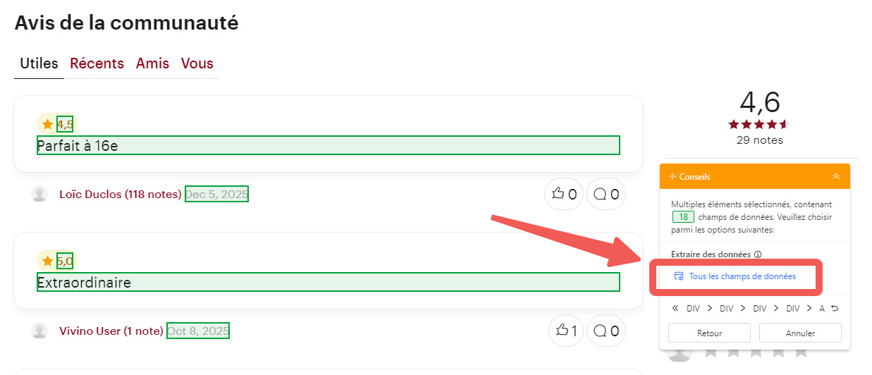 Ensuite, sur les sous-pages, il vous suffit de cliquer quelques fois pour choisir les champs que vous souhaitez extraire (par exemple, le nom du vin, le nom du domaine, l’année, le nom et le contenu des commentaires des utilisateurs). C’est très simple !