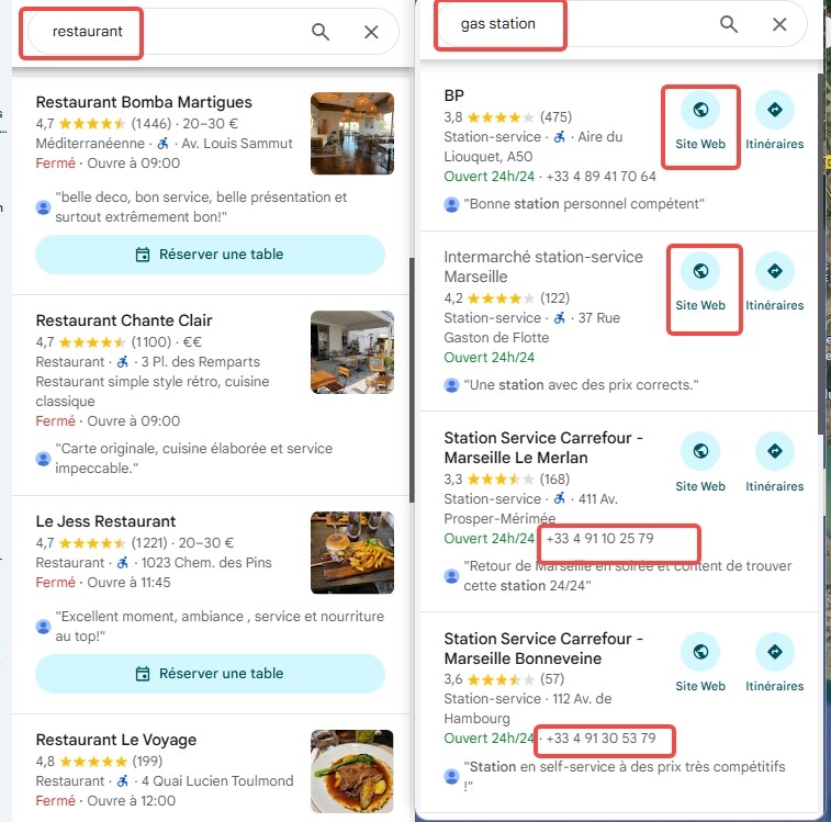 Le modèle extrait uniquement les données à partir de la page de l’établissement, où le site web et le numéro de téléphone ne s’affichent que pour certains mots-clés spécifiques, tels que station-service. S’il ne récupère aucun site web ni numéro de téléphone, cela signifie que ces informations ne sont tout simplement pas présentes sur la page de l’établissement. Il est toutefois recommandé d’utiliser le Google Maps Leads Scraper (via URL) pour extraire les sites web et les numéros de téléphone.