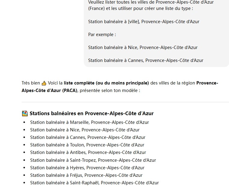 Si vous ne connaissez pas les sous-localisations d’une zone principale, il est recommandé de demander à l’IA de générer une liste de mots-clés + localisations afin d’élargir votre recherche. Par exemple, voici une capture d’écran montrant comment utiliser l’IA pour le faire à votre place.